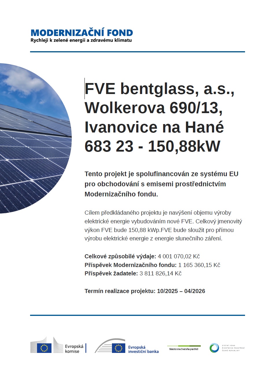Projekt je zaměřen na zahájení výroby skleněného fotonického panelu, jehož funkční prototyp vznikl na základě společného výzkumu společnosti bentglass a.s. a VUT v Brně. Pro zahájení výroby tohoto produktu je nutná instalace nových výrobních technologií. Na projekt je poskytována finanční podpora Evropské unie.